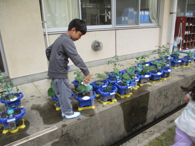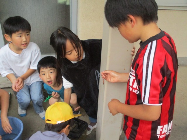 野菜の苗の世話と共に、中庭の池周辺に生息する生き物(ドジョウ・カナヘビ・アメンボ)の飼育にも夢中な子供たちです。