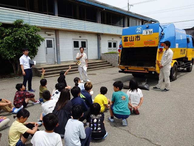 3クラスで順番にパッカー車見学と体験、事業についての説明会、活動の振り返りと、3つの輪番でたっぷり学びました。