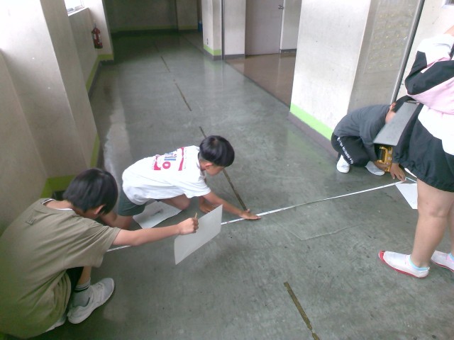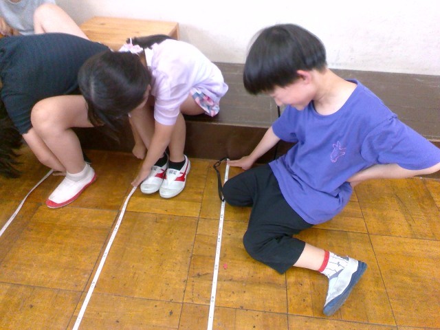 端を合わせ、伸ばした巻き尺が真っ直ぐになっているか確認するなど、友達と協力して正確に長さを測ろうとしていました。
