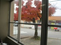 2年生廊下から見えるモミジです。真っ赤でまさに燃えるような眺め。雨が落ちてきてい...