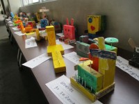 3年生の木工作品が一斉に廊下に展示されました。ペン立て、動物のモニュメント、不思...