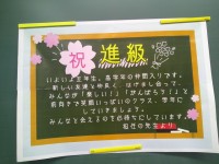 進級した子どもたちへ、担任からのメッセージです。 教室の黒板に準備されています。