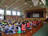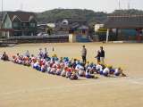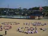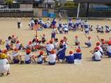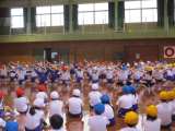 4年生が3年生に相撲体操の手本を見せています。スポーツフェスティバルには、堂々と...