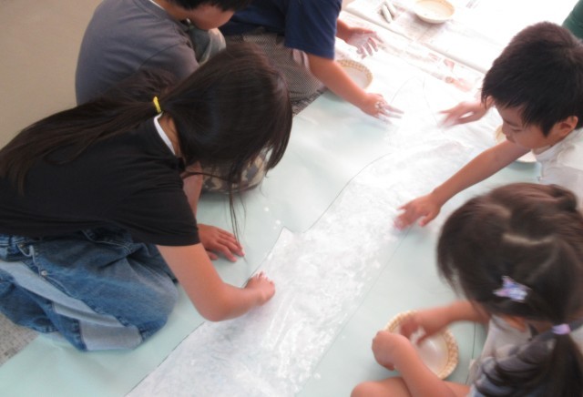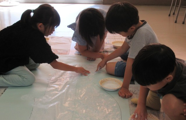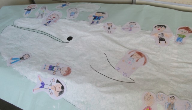 絵具を使って、指でくじらぐもを描きました。団ごとに声をかけあいながら、自分たちが乗るくじらぐもを完成させました。