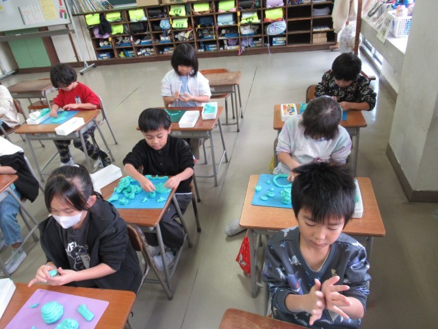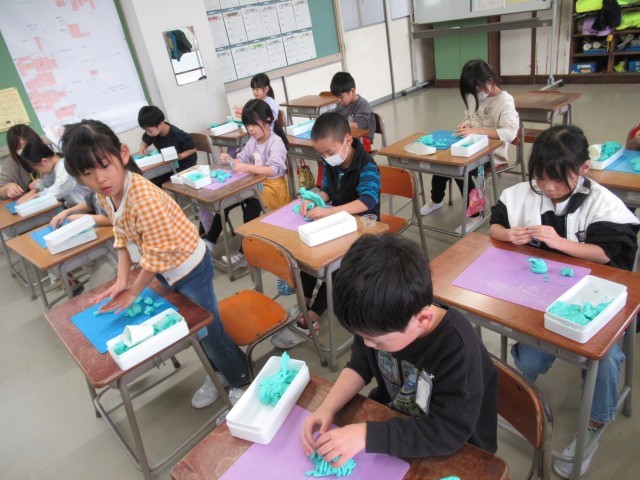 1年生の子供たちは粘土の学習が大好きです。作りながら、頭の中でストーリーを思い浮かべ、そのストーリーに合うように作品作りをしているようです。