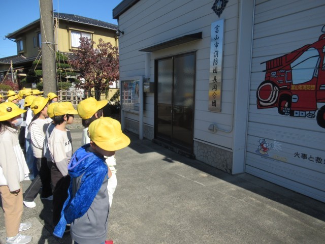 社会科の学習で「まちの中にある消防施設をさがそう」という学習に取り組んでいます。今日は、学校にある「防火水槽」や「避難場所」の看板、富山市消防団長岡分団、地域の消火栓などを見にいきました。