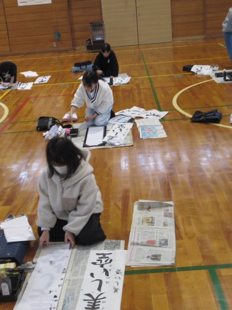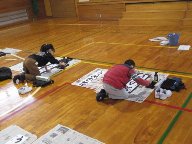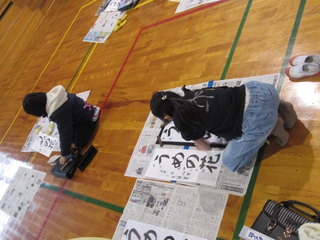 1・2年生は教室で硬筆墨で、3~6年生は体育館で書初め用紙に書きました。