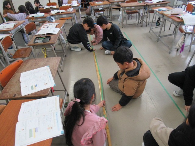 算数科でメートルを学習しました。子供たちは、3メートルの紙ものさしを作って教室だけでなく学校中を測りました。毎日使っている校舎や教室等の長さを体感していました。