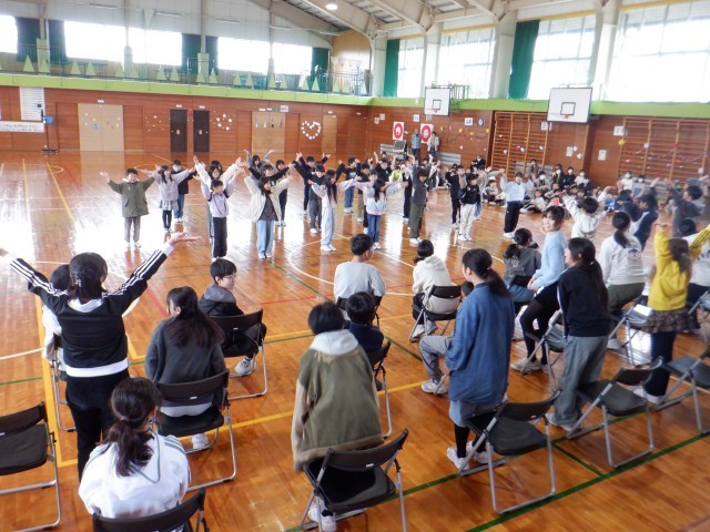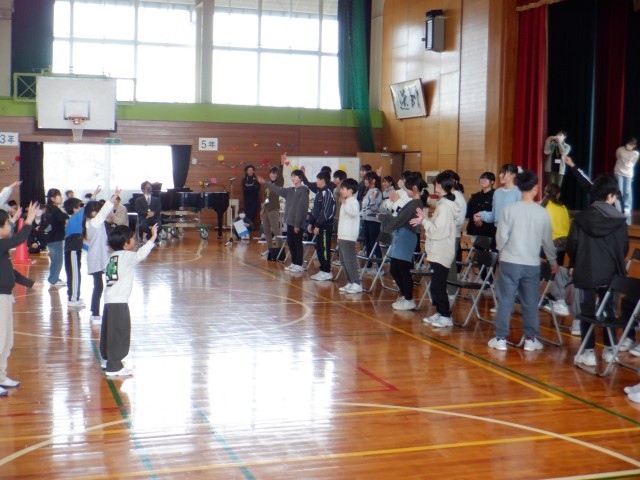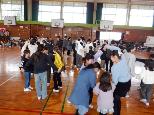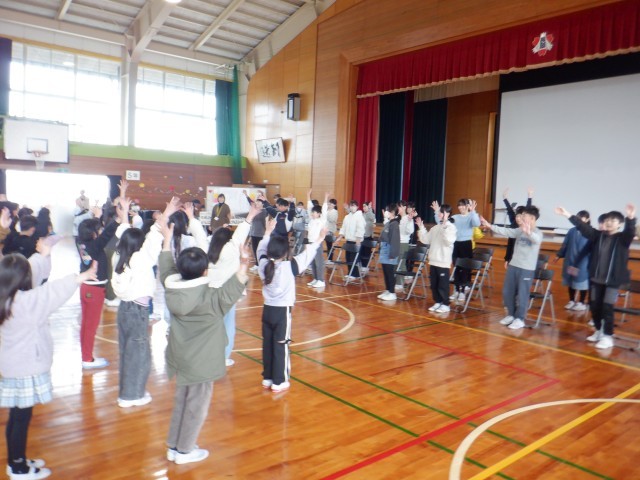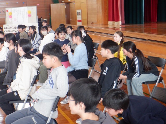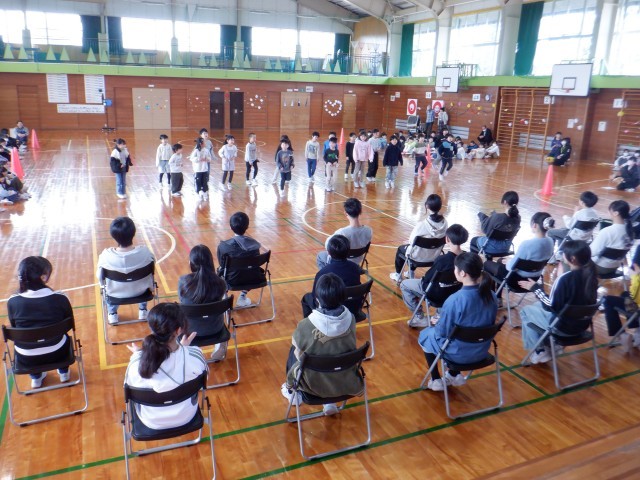 「全校みんなで6年生に感謝を伝え、中学生になっても頑張れるような、心に残るお祝い週間・集会にしよう」という目当てのもと、5年生を中心に在校生が集会を企画し、6年生を招待してくれました。ありがとうの言葉や踊りやクイズ、歌、ゲーム、お手紙など、6年生に喜んでもらおうという、下級生の気持ちが伝わってくる、出し物ばかりでした。6年生は「ありがとうの気持ちがすごく伝わってきた」「こんなに心を込めてお祝いしてくれてうれしい」「すごく楽しかった、心に残る思い出になった」と感謝と喜びをかみしめていました。