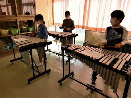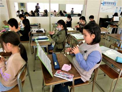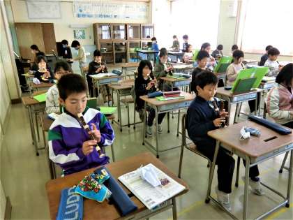 音楽室。3年生が器楽合奏を楽しんでいました。曲名は「パフ」です。