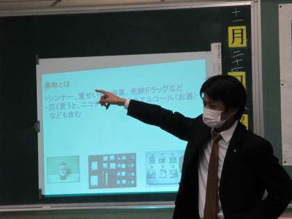 学校薬剤師の方をお招きし、薬物乱用防止教室を行いました。薬物には依存性があることや、脳や体の機能に悪影響を及ぼすこと等を学びました。