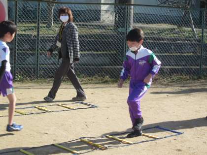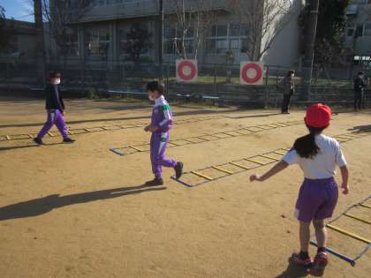 すこやか活動の様子。色団別にジャベボールやラダーで身体を鍛えました。