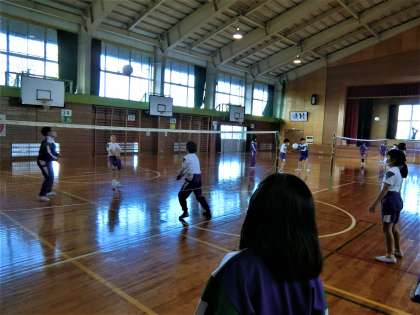 体育館で、ビーチボールによるバレーボールを楽しむ4年生。