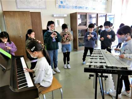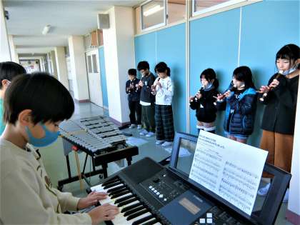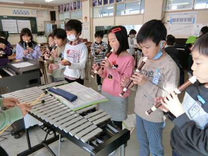 3年生の音楽科の学習。リコーダーを主に、打楽器や鍵盤楽器の音を重ねて、グループごとにアンサンブルを楽しみました。