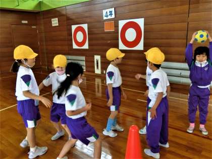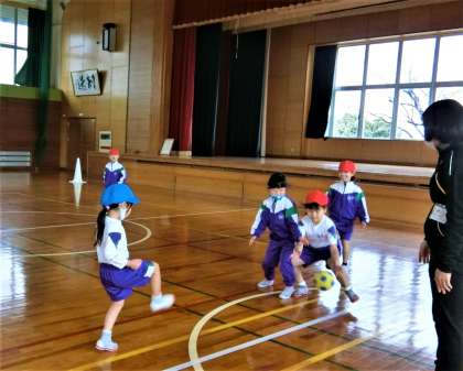 体育館で、ボール蹴りゲームを楽しむ1年生。