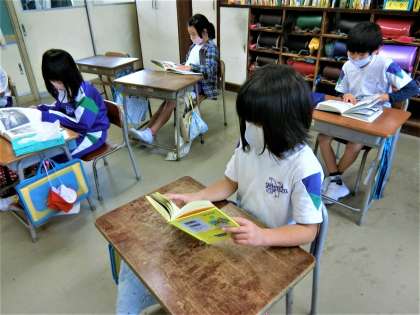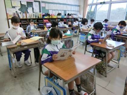 朝の読書タイム。教室で、本に親しむ2年生。
