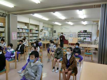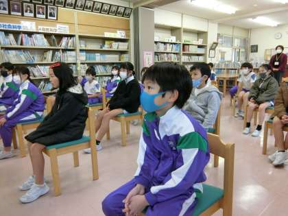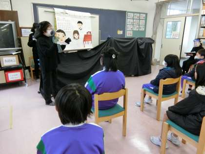 図書室で、お話の会「夢」の皆様が、3年生に人形劇を見せてくださいました。