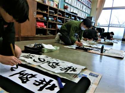 「希望の道」の手本を見据えて、書き初めの練習に打ち込む6年生。