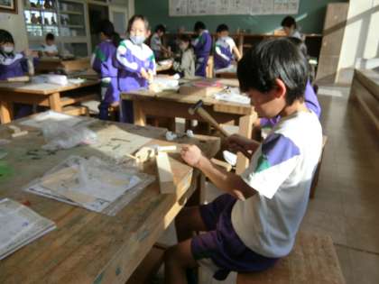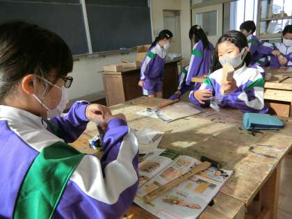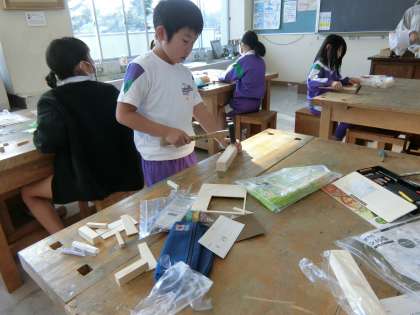 図工室の3年生。これから、板に金槌で釘を打って物作りをするのだそうです。