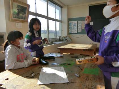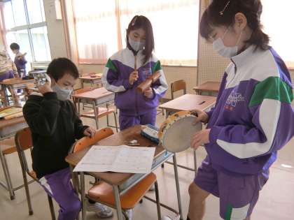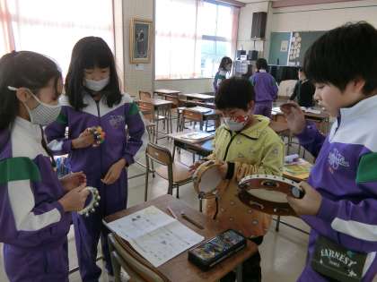 音楽室の4年生。タンバリンやカスタネット、鈴やトライアングルの音を重ねてオリジナルの音楽を創作しています。