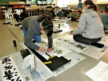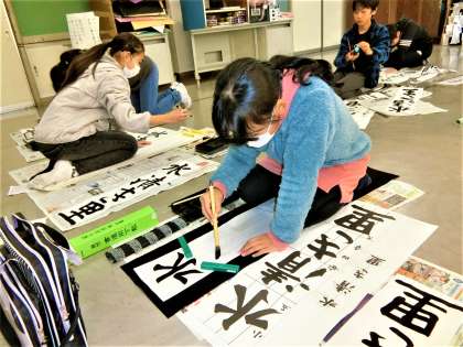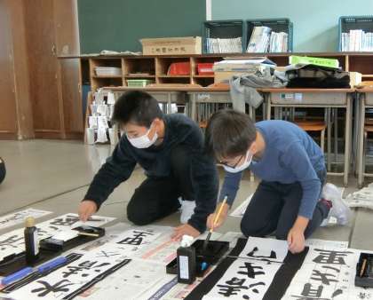 題字は「水清き里」。はね、はらい、とめに気を配って揮毫する5年生。