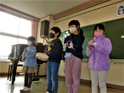 音楽室の1年生。トライアングル、カスタネット、タンバリン、鈴・・・いろいろな楽器の音色を楽しんでいます。