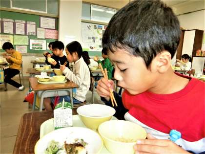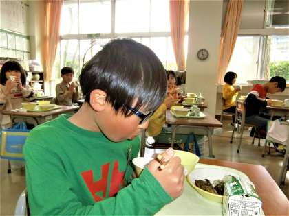 給食の時間になりました。今日の献立は、五目ごはんに、魚の磯辺揚げ、ゆかり和え、味噌けんちん汁、牛乳です。おかわりする子が続出の2年生教室。