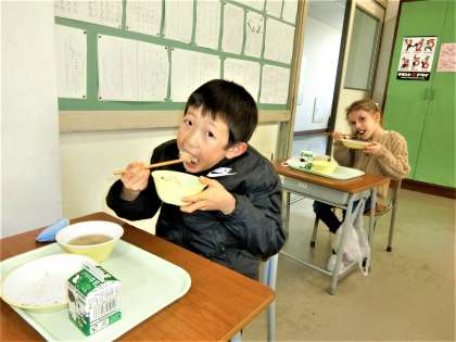 「五目ご飯とけんちん汁がおいしい」という子。「魚(ふくらぎ)の磯辺揚げがおいしい」という子。おいしい顔がいっぱいです。