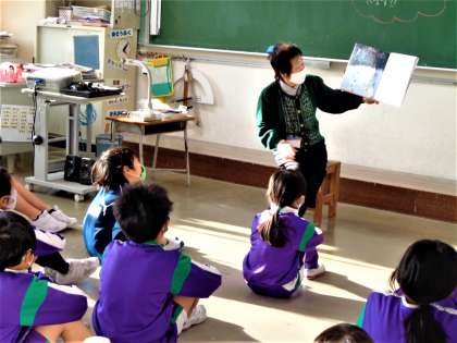 お話の会「夢」から先生をお招きし、今日は、低学年教室で、本の読み聞かせをしていただきました。