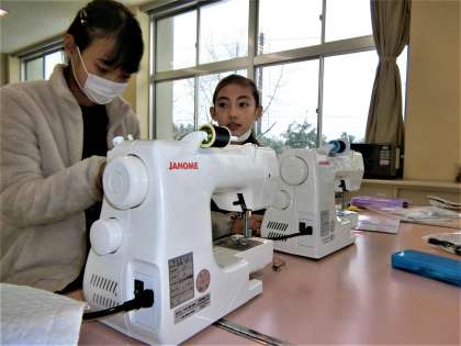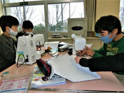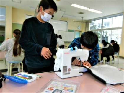 家庭科室の5年生。ミシンの操作に慣れ、作品の完成は間近です。