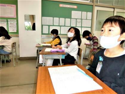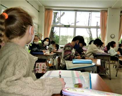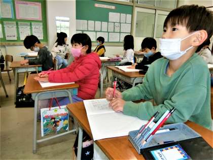 黒板に書かれた連絡事項をノートに書き写す1年生。2学期も、多くの技や知恵を身に付けました。