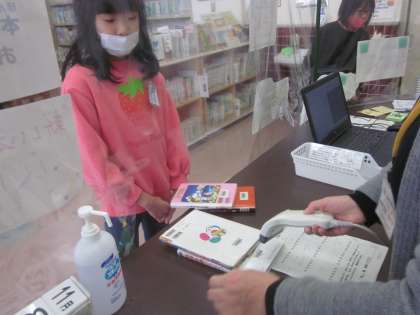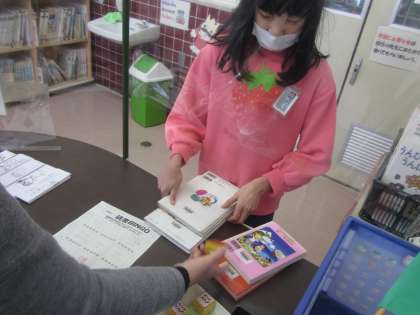 図書室での様子。読んだ本を返却し、図書ビンゴカードにスタンプを押してもらいました。