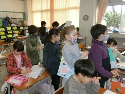 下校間近。1年生教室には、連絡帳を手にした子供たちの行列ができていました。