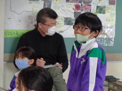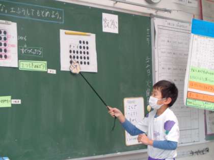 2時間目の算数の時間は、ワークシートに並んでいる24個のドットをかけ算を活かして工夫して求める学習でした。2年生の子供たちからは、「まとまり」「いくつ分」「パズルみたいな形では時間がかかる」等、かけ算の意味を理解している発言がどんどん出てきました。互いの工夫のよさを認め、学び合う温かい雰囲気に包まれていました。