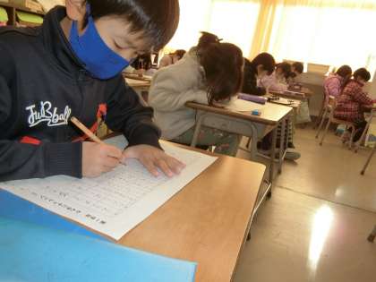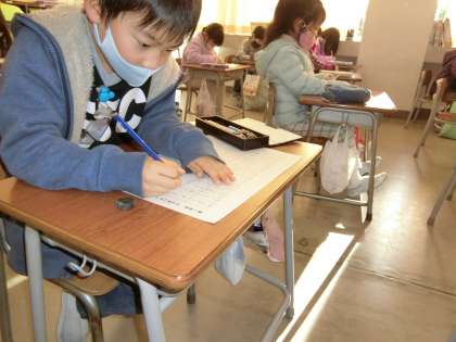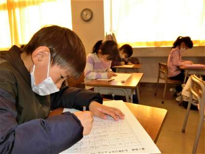 2学期最終日の1年生教室。漢字や片仮名の復習をする1年生。