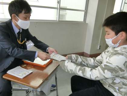 各教室で、担任が、通知表「あゆみ」を子供たちに手渡しました。