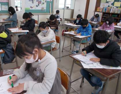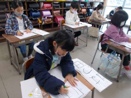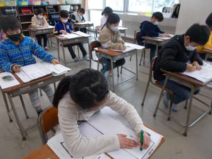 「はつ日」と力強く揮毫する2年生。練習の成果を発揮しました。