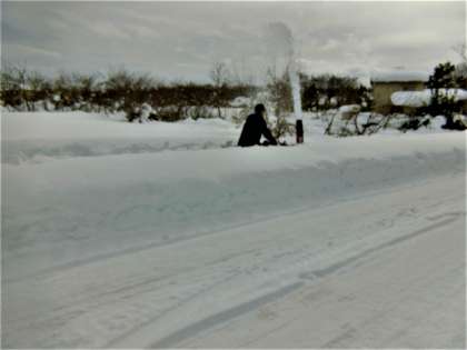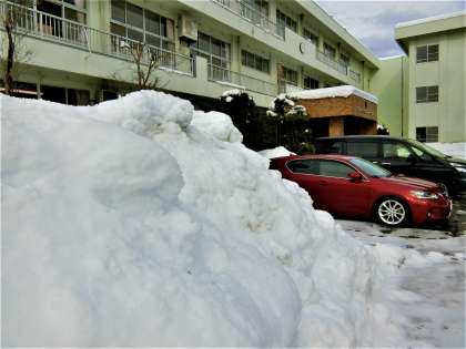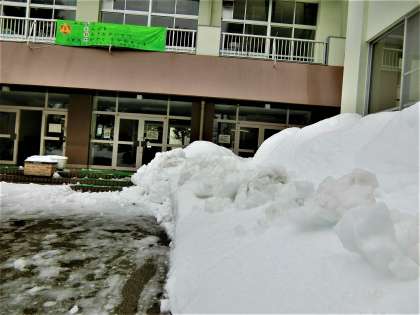 大雪のため、臨時休業になった学校の様子。前庭には雪の山。除雪機で道をつくってもらいました。