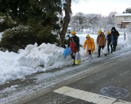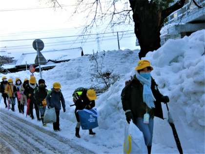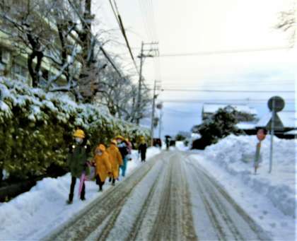 新たにうっすらと積もった雪を踏みしめて、久々に子供たちは登校しました。