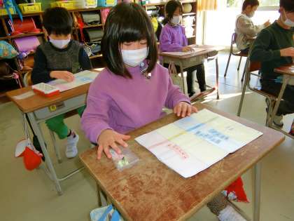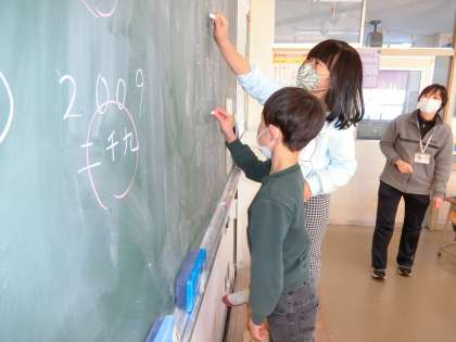 十のかたまり、百のかたまり等に注目しながら、十進位取り記数法について学ぶ2年生。