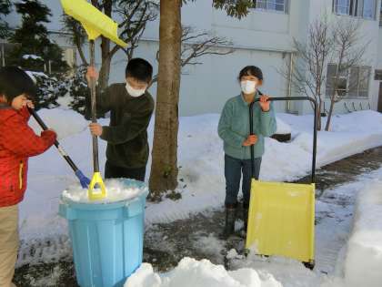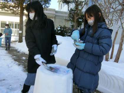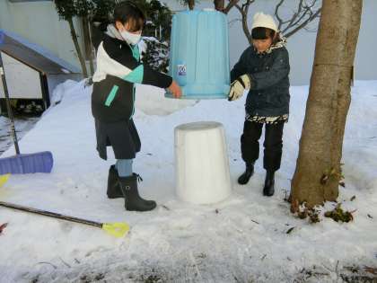 環境委員会主催の交流活動。雪を型に入れたり着色したりして雪の造形遊びを楽しみました。