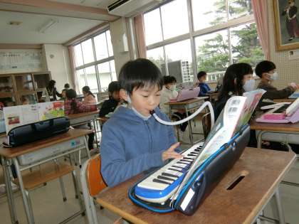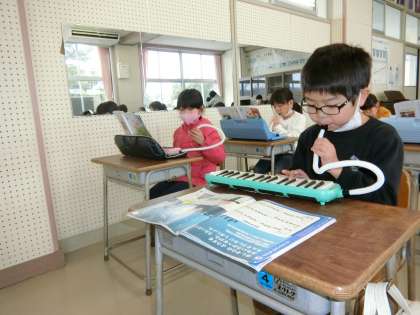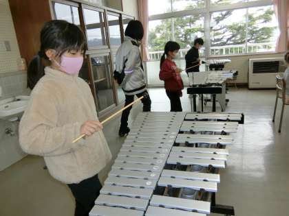 音楽室の1年生。鍵盤ハーモニカや鉄琴などの楽器で合奏を楽しみました。