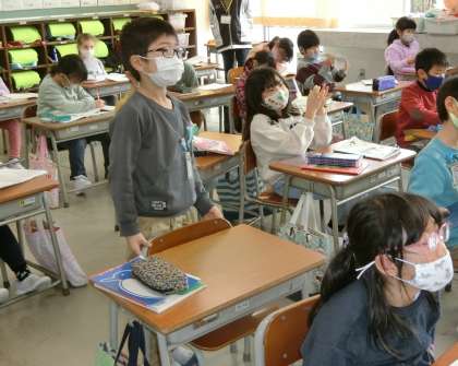 国語の時間。1年生は、「たぬきの糸車」のどこをどのように読めばよいか話し合っています。