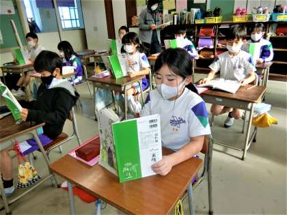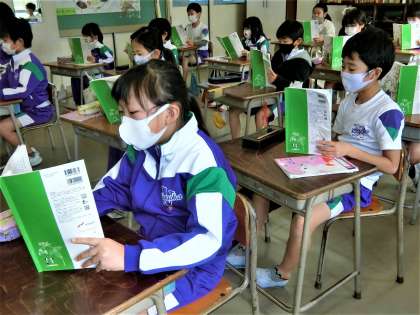 2年生の国語の授業。正しい姿勢で音読しています。