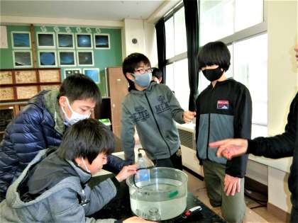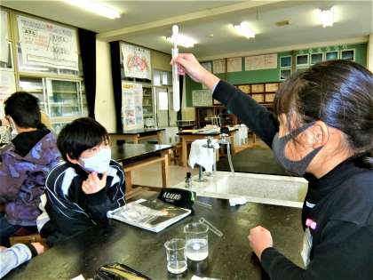 理科室の6年生。今日は、二酸化炭素を水にとかして炭酸水をつくり、確実にとけているかどうかを石灰水で調べました。