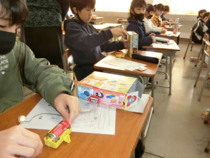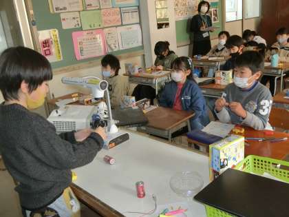 豆電球に、ソケット、導線、乾電池をつないで、明かりがつくときとつかないときを調べる3年生。