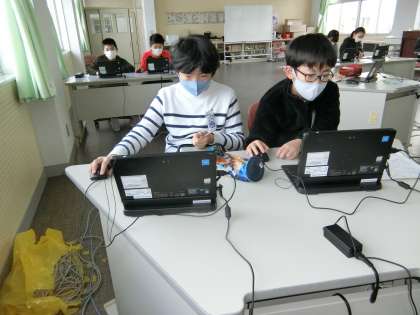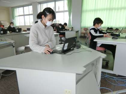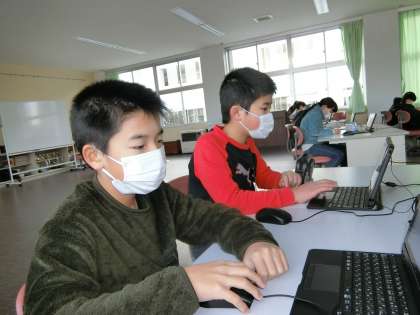 コンピュータ室で、卒業を祝うプロジェクトの準備を進める5年生。