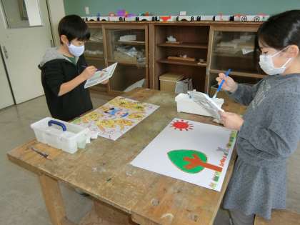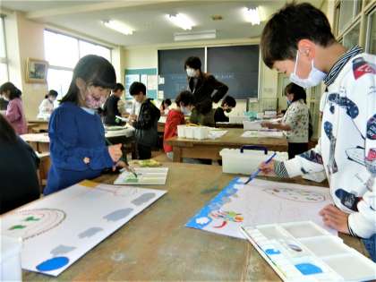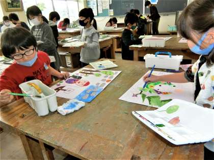 物語の絵を描く2年生。水彩絵の具を混ぜて、思ったとおりの色や思った以上の色がつくれたときは、とても嬉しそうです。