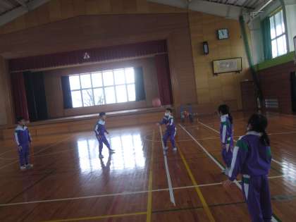 体育科の学習。ボールを投げたりキャッチしたりする運動を楽しみました。