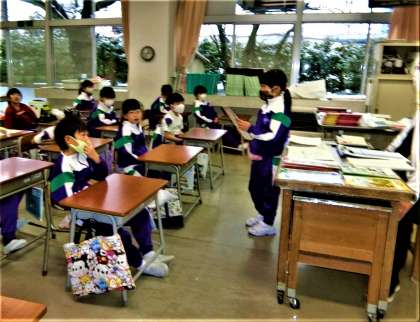 日直当番が前に立ち、これから朝の会が始まるところです。